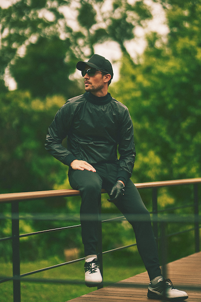 肩を動かしやすいラグランスリーブ設計に加え、軽くさっと着用し風の侵入を防ぐ、初秋のラウンドに最適な一枚。