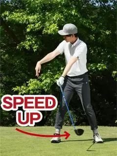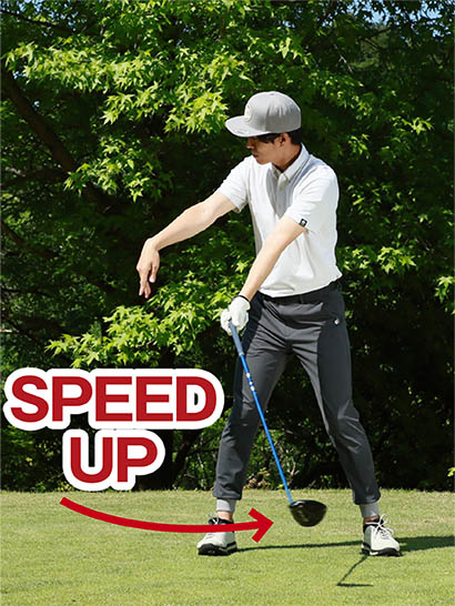 インパクトで頑張って力を入れても、肝心のクラブヘッドには力が伝わりません。この素振りで力を意識するタイミングや、脱力によってクラブヘッドの加速スピードが上がる感覚をつかんでください。