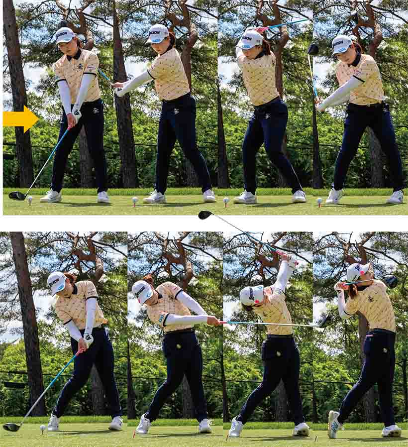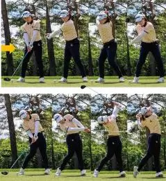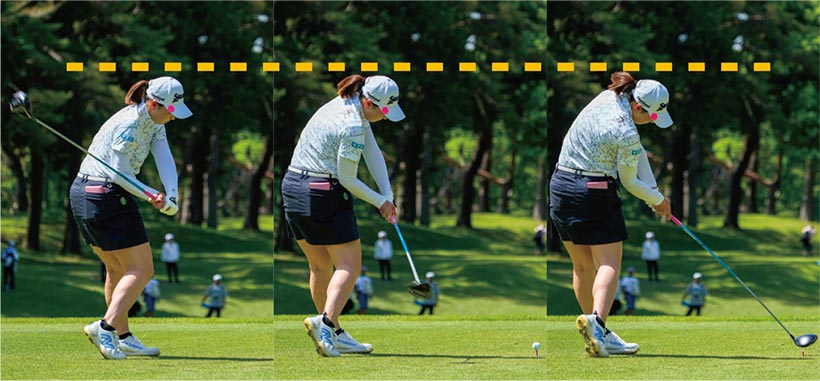 竹田のスイングで特徴的なのは、ダウンスイングからフォローにかけて、上体の前傾角度がほとんど変わっていないことだ。同時に頭の高さも変わらないため、インパクトではクラブフェースの芯でボールをとらえることができる。当然、飛距離アップにもつながる。