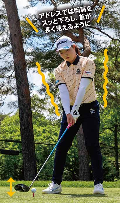 アドレスでは両肩をスッと下ろし、首が長く見えるように