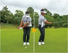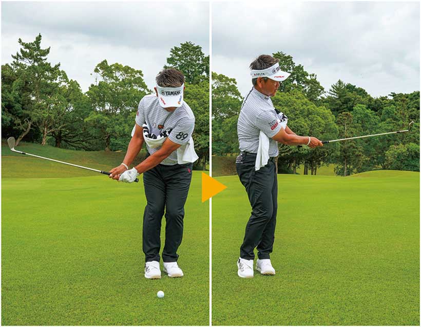 また応用編として、左ワキだけにタオルを挟む練習法もオススメです。これはインパクトで左ワキがあまくなる(開く)人や、フォローでクラブを目標方向に出し過ぎる人にとくに有効。ダウンスイング以降、体を左に回しやすくなり、回転とともにクラブを左に振るという正しい感覚がつかめます。