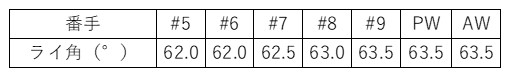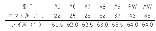 特徴として、5、6、7番はロフト間隔が3度、7、8は4度、8、9、PWは5度、PWとAWの差は6度となっています。