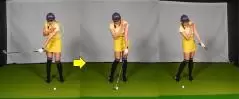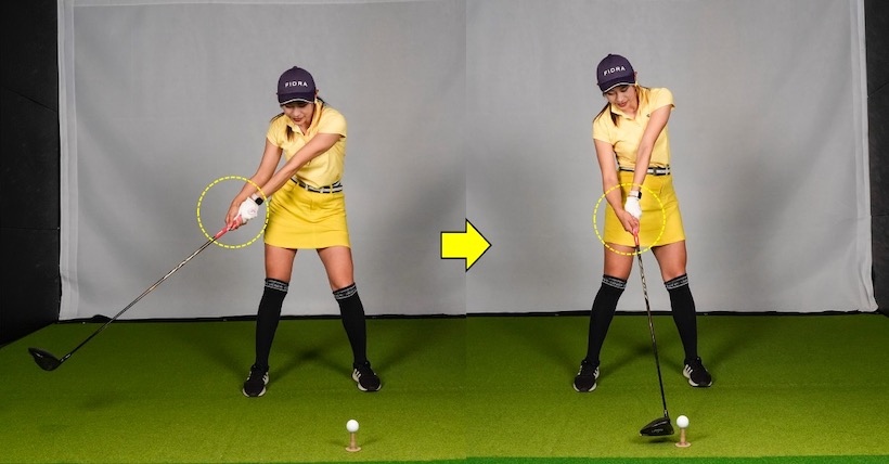 アーリーリリースをなくすには左手主導でクラブを下ろしましょう。切り返しで左手親指が上を指す“サムアップ”スタイルを作り、インパクトで左手の甲がターゲットを向くように下ろしてきます。ダウンスイングで左手の甲が上を向いたらアウトです。