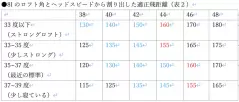 確認できたら下の(表1)をご覧ください。横の欄はヘッドスピード、縦の欄はロフト角です。ヘッドスピードについては38m/sは遅め、40、42m/sは平均的な速さ、44~46m/sは平均より上、48m/sはプロレベルです。