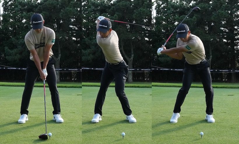 ④バックスイングで手や腕を上に持ち上げる意識をなくしましょう。バックスイングはカラダを右へネジったらおしまい、という感覚でOKです。
