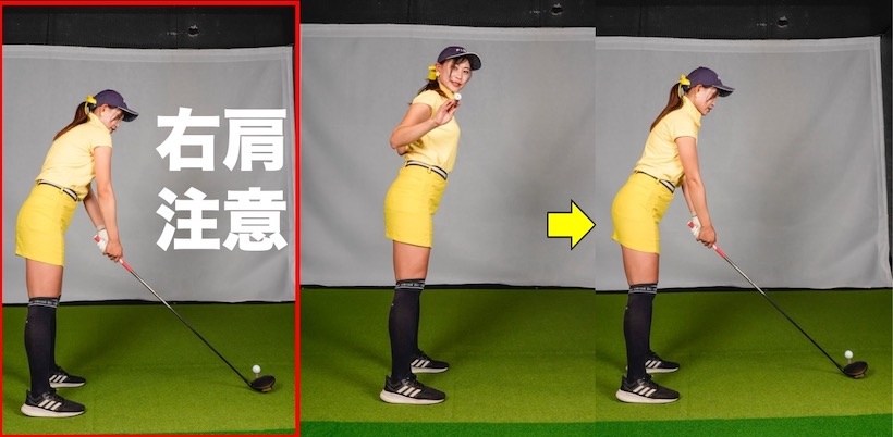 完璧なスクエアアドレスは難しいとしても、最低限スクエアにしておかなければならないところがあります。それは肩のラインです。アマチュアの方の場合、アドレスで右肩がかぶることが多いので要注意。そのまま振るとターゲットラインに対してクラブがカットに入るので飛びません。右腕を張るとこうなりやすいので、右ヒジを緩める、右肩を引くなどして、左右のヒジの高さを揃えましょう。