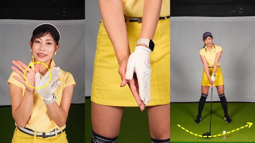 ついでに言っておくと、グリップは両手ともに親指の付け根をキュッと締め、いわゆるV字を作った状態で、両手のひらを合わせるように握ります。また、クラブヘッドはスイングの最下点に置くといいでしょう。ボール位置が左カカト延長線上ならボールの手前にヘッドを置く感じになります。ヘッドがそこを通り、アッパー軌道でボールにコンタクトすることで飛ばしに必要な打ち出し角が得られます。