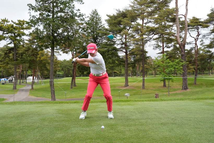 腕を主体にしたスイングもカラダの回転を主体にしたスイングも、スウェーをするとよい結果には結びつきません。スイングの仕方はもちろん大切ですが、その前に、岩井明愛選手のようにカラダのムダな動きを抑えることをもっと意識してほしいと思います。