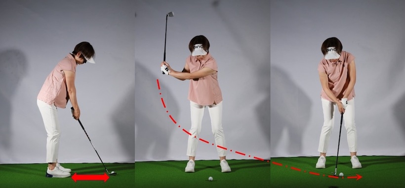 ボールから離れると手と腕が自由に動いて振り幅が大きくなります。ショットはそれでもいいですがヘッドスピードを上げる必要がないアプローチではマイナス要素。Eさんのように飛びすぎたり、インパクトで緩んだりで距離感が合わなくなってしまうのです。