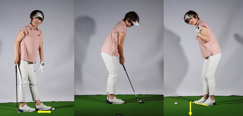 ということで、まずは極端にボールの近くに立っていただき、手だけが動かないことを確認していただきました。右ワキ腹に右腕をはめ込んで構える感じです。ボールとの距離の目安はシューズ一足分くらい。ややオープンスタンスにすると左足が邪魔にならないので、よりボールの近くに立てます。ただし、オープンにするのは足と腰。肩のラインはスクエアにしておきます。