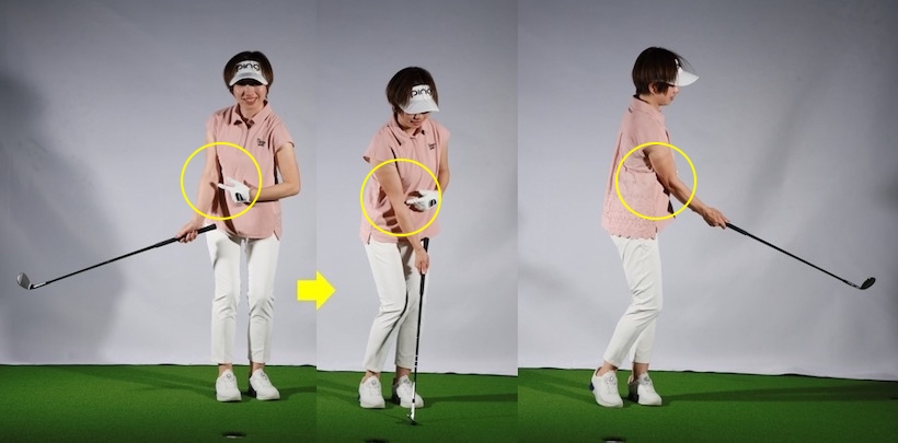 また、右腕を右ワキ腹にくっつけて一体化させたまま動かしていただきました。ちょっと極端な言い方ですが、「右腕と体が縛られている感じで動くといい」とお伝えしたところ、イメージしやすかったのか、安定したアプローチが打てるようになりました。