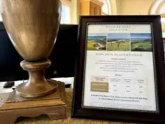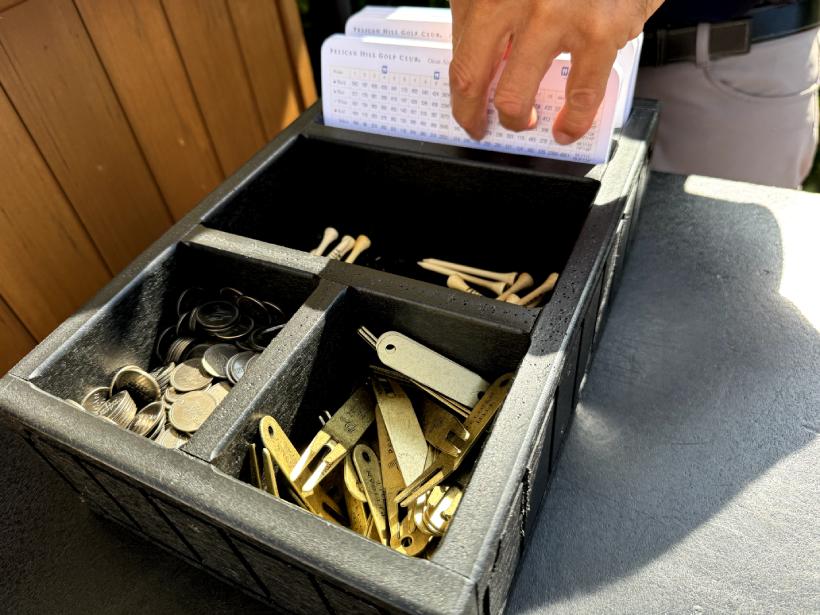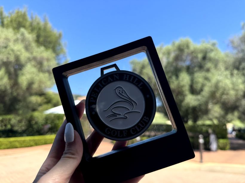 ペリカンヒルのオリジナルグッズは、ポロシャツやキャップ、ヘッドカバーなどのゴルフアイテムのほか、ワイングラスやブックカバーなども販売されていた。記念にネームプレートを購入。名前を入れてもらうサービスはもちろん無料で、ラウンド後に取りに来てね、とのこと。