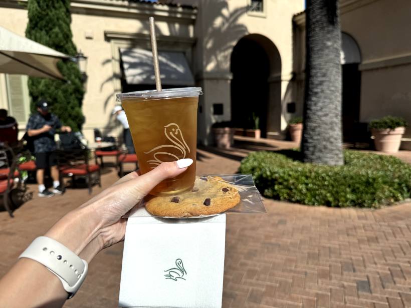 練習をしてお腹も空いてきたところで、敷地内にあるカフェへ。サンドイッチやスナック、シリアルやヨーグルト、フルーツまでなんでも揃っていた。私はクッキーとアイスティを購入。外のテラスで朝食をとっている方も多くいた。
