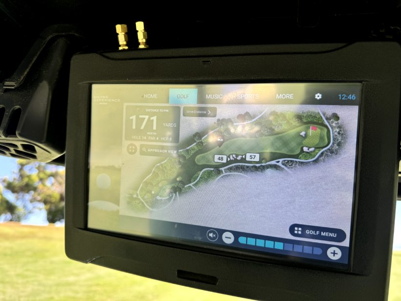 カートについているタブレットには、日本同様コースごとのGPSナビが表示されていた。上のタブの「MUSIC」では、Bluetoothの設定画面がありカートで音楽を流すことが可能。うん、アメリカっぽい!私はいつもスピーカーを持参しているので、このカート最高!