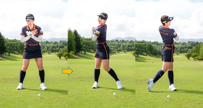 1つは体をできるだけスピーディーに回すことです。力が入ってしまうと逆効果なので、細かいことは気にせずに素早くターンするだけでOKです。短く持つことで、いつもよりかなり振りやすくなっていると思うので誰でもできると思います。