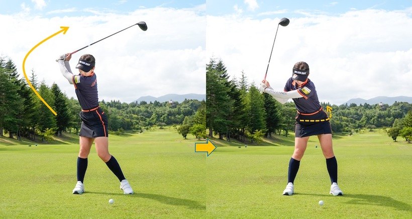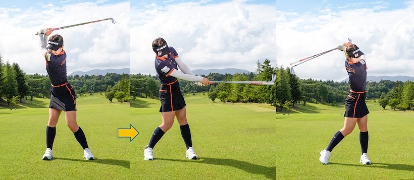 もう1つはバックスイングで肩を深く回したら、切り返し以降は腰から回すようにすること。こうするとダウンスイングで上半身と下半身の間に捻転差ができますから、さらにヘッドスピードが上がります。ただ、こちらはちょっと難しいかもしれないので、そのイメージで振っていただく感じでいいと思います。