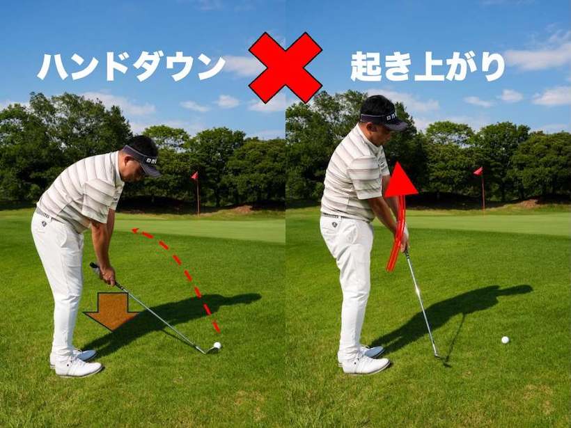 また、ボールに体を近づけようとしてハンドダウンするのもいけません。ヘッドが抜けていくイメージが湧きませんし、ヘッドの通り道がないので、ボールにヘッドをアプローチさせる過程で無意識に体が起き上がって手前を叩くかトップしてしまうでしょう。うまく当たったとしても、左に引っかけてしまうことでしょう。