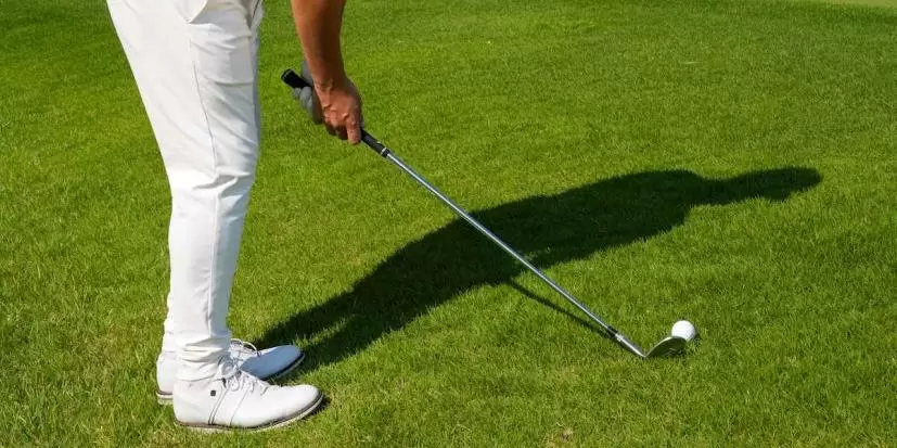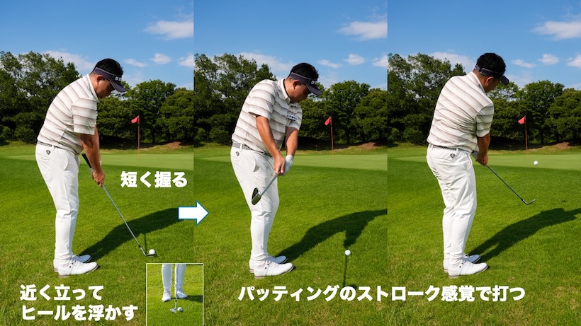グリップはシャフトを握るくらいまで短く持ちます。そして、ヒールは少し浮かせて構えます。ヒールを浮かせると、ヘッドが傾斜に引っかかるイメージを消せますし、ボールに対してヘッドがフラットになるのでより引っかけにくくなります。