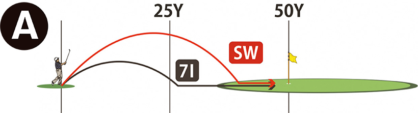 50ヤード先のピンをどう攻めるか。そこで最初に考えていただきたいのは、50ヤードを半分に分けて「25ヤード+25ヤード」とすると、半分の位置がグリーンの外なのかグリーン上なのか、あるいはグリーン面がどのくらい使えるか、といったことです。