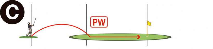 今は大きなグリーンが多いですから、イラストCのようにちょうど半分の位置がグリーン上のこともよくあります。この場合はグリーンの面が広く使えますから比較的やさしく打てます。