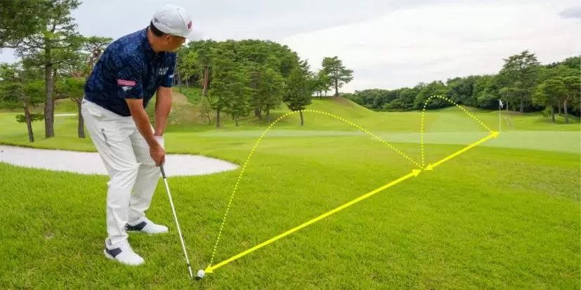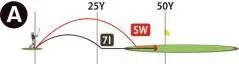 ところで、アマチュアの方々は練習場で50ヤード先の表示板などをキャリーで狙って打つ練習をされていることと思います。ピッタリ50ヤード打てれば満足するかもしれませんが、この練習の成果をコースで試してみても大抵はピンをオーバーしてしまいます。落とした場所で止められな人たちにとっては、60ヤードくらいのアプローチの練習になってしまっているからです。