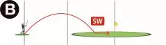 ラフや傾斜地などボールのライがよくない場所から打つときは、フェアウェイ以上にスピンがかかりにくくなります。それだけボールが止まりにくいのです。グリーンの面があまり使えないなら、グリーンの手前側に落とし場所を決める。BやCのようにグリーンの面が使えるとしても、ランが多く出ることを想定して落とし場所を設定する。つまりピンまでが50ヤードなら、40ヤード以上は絶対に打たないと言う思考を持つことが大切なのです。