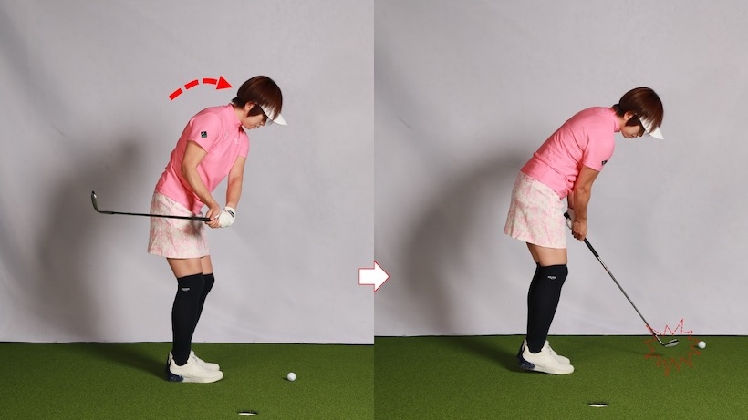 ヘッドが前に出るのを防いだことで、今度は手元が体から離れなくなり、インパクトで前のめりになることもなくなってしまったのです。