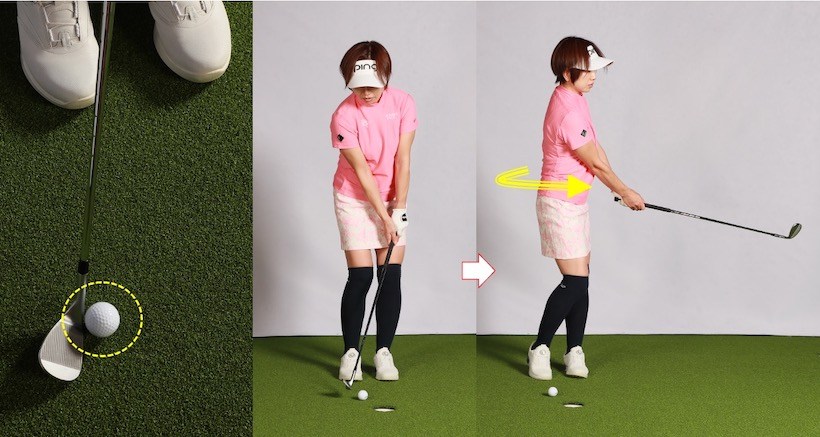 ヒール側にボールがくるようにアドレスすることで、まずボールとの距離が適正になりました。そしてトゥで打つイメージをもっていただくことで、ヘッドが前に出ることがなくなりました。