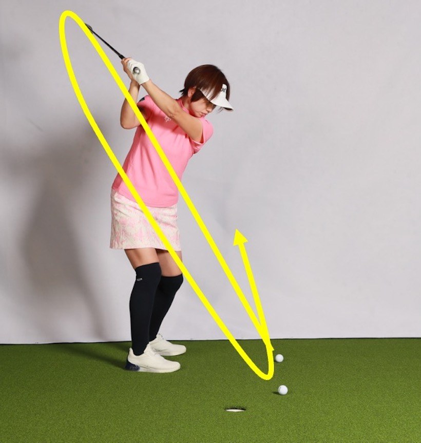 これを正しくループする方向に持っていく。すなわち、テークバックをアウトサイドに引き、ダウンスイングでインサイドからクラブが下りるようループさせる練習をSさんにはしてもらうことにしました。