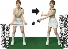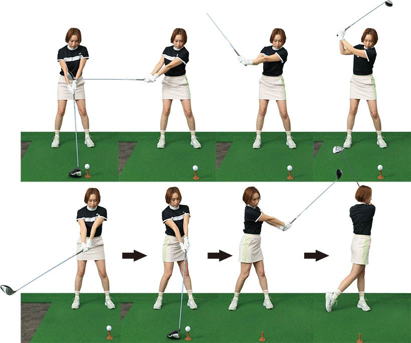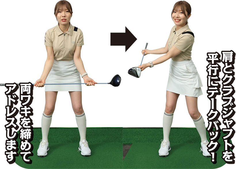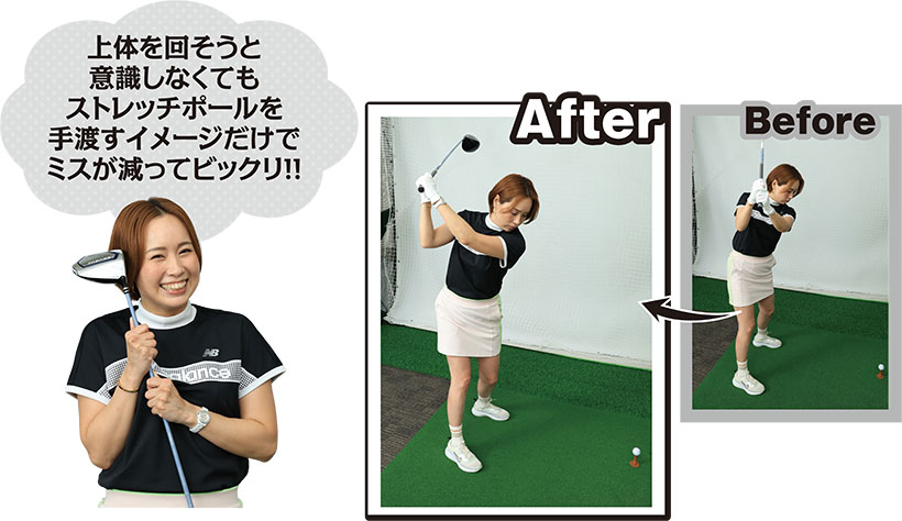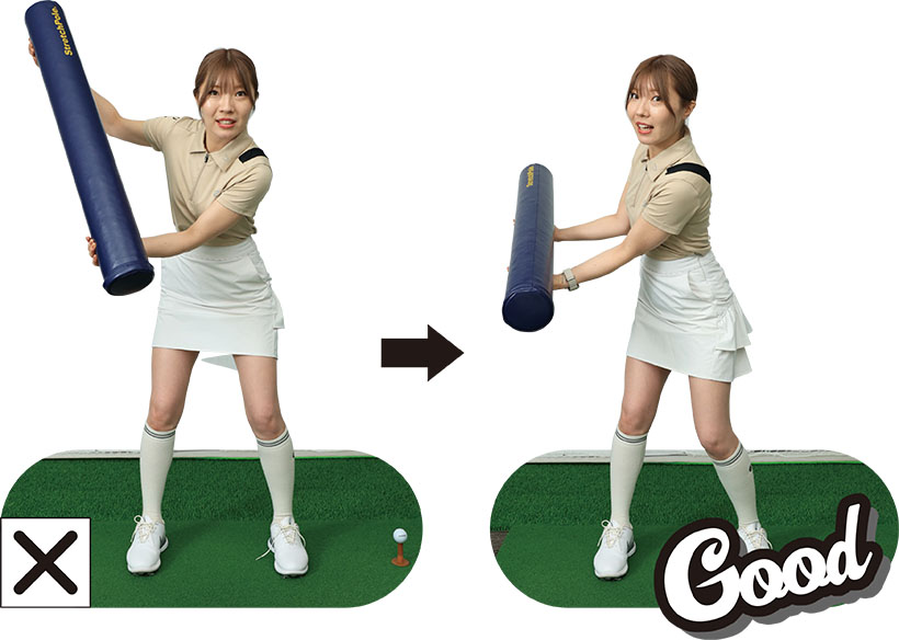 コースで実際にドライバーを打つ前にも、ストレッチポールで覚えた動きを、クラブに置き換えてやってみましょう! アドレス時から両ワキを軽く締めるのがポイントです。これで上体が回りやすくなるので、ラウンド前の準備運動代わりにもオススメです!