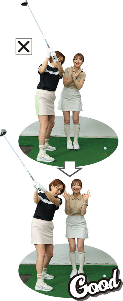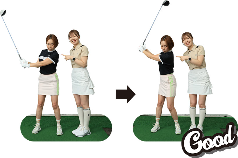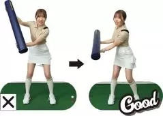 テークバックで上体を回せていないため上半身が起き上がってしまい、クラブがアウトサイドから下りてきてフェースが開きやすくなることで右に飛び出すミスや、ヒールに当たりミート率が悪くなっていた!