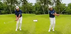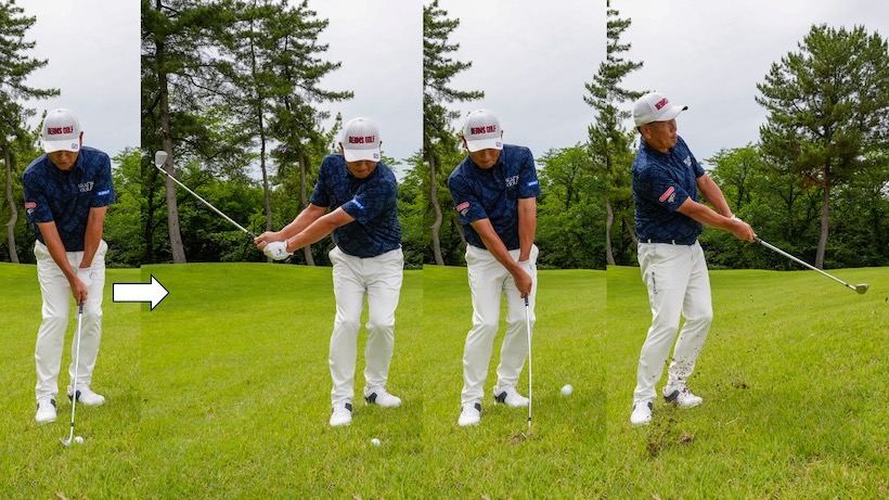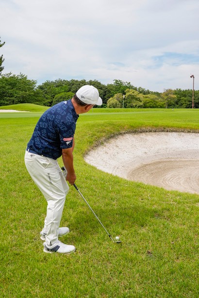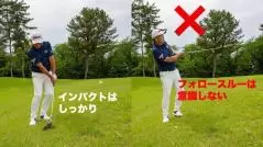 スイングに関しては斜面に沿って振るイメージとなりますが、クラブを目標方向に振り抜こうとした瞬間に距離感を合わせるのが難しくなる点に注意。バックスイングは平らなラフで素振りした感覚でいいですが、この場合はクラブを振り抜かなくても構いません。