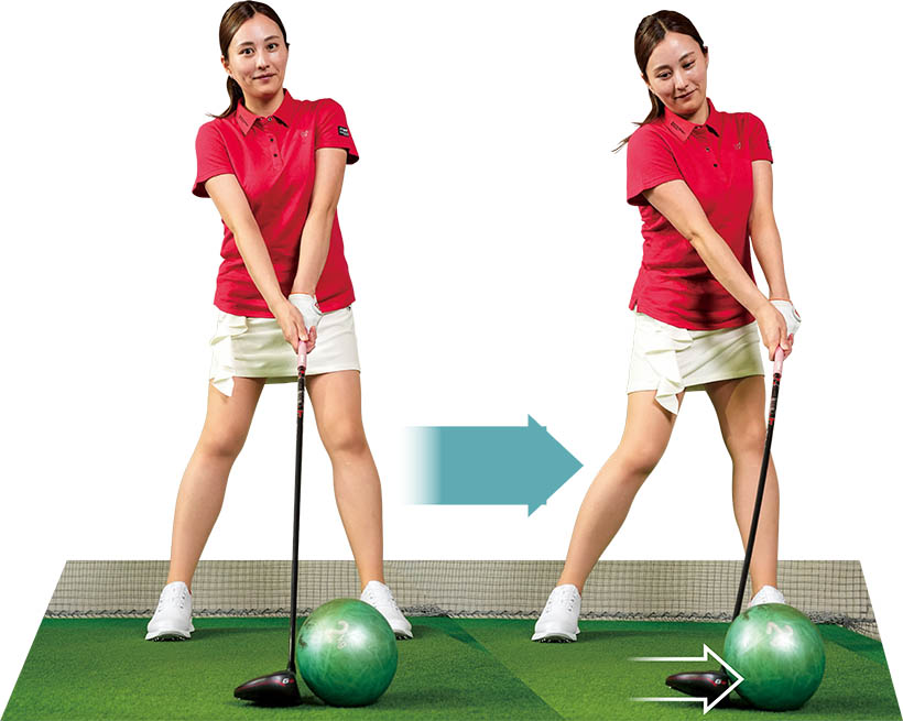 重めのボールや固定物にフェース面を当ててアドレスを作り、目標方向に真っすぐ押そう。体重を左足に乗せて腰を左に回せば強く押せるハンドファーストの体勢となる。