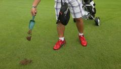 ディボット跡に凹みが埋まるように目土を入れます。少し盛り上がるくらい多めに入れましょう。そのあと、シューズの底やクラブで平らにし、最後に足で踏みならしましょう。目土は多過ぎず、少な過ぎず。周りと同じ高さにするのがポイントです。