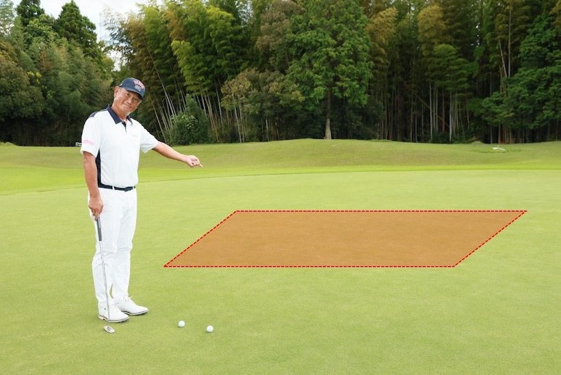 1 練習グリーンでなるべく平らなところを見つけます