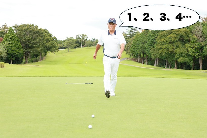 仮にそれが10歩の距離なら、平らで10歩のパットは気持ちよく振れば寄ります。8歩の距離や下り傾斜ならやや弱め、12歩の距離や上り傾斜ならちょっと強めに打つ、といったように、気持ちよく打てる10歩の距離のストロークを基準に、打つ距離をコントロールします。