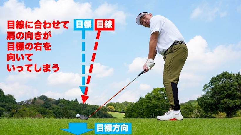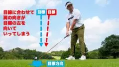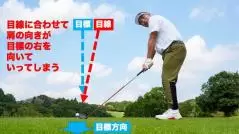 そのどちらも、確認・微調整の過程で「肩」のラインがどんどんターゲットの右や左を向いていきます。これによって、ターゲットに対して正しくアドレスできなくなっているのです。