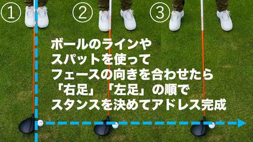 それができたら、僕の場合は左足の位置を調整、次に右足の位置を調整してスタンスを作り、アドレスを完成させます。