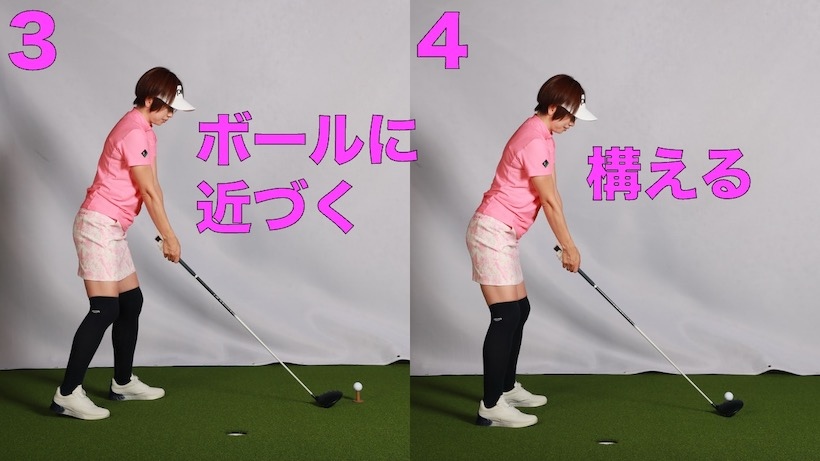 ですから、まずはアドレスの形を作ることが先決。ボールとはちょっと距離を置いたところで、自然に立った状態でクラブを握り、前傾してアドレスを作り、その姿勢を崩さないようボールのところに移動してヘッドを合わせるのです。これを習慣化すれば、ボールとの距離はいつも一定になります。