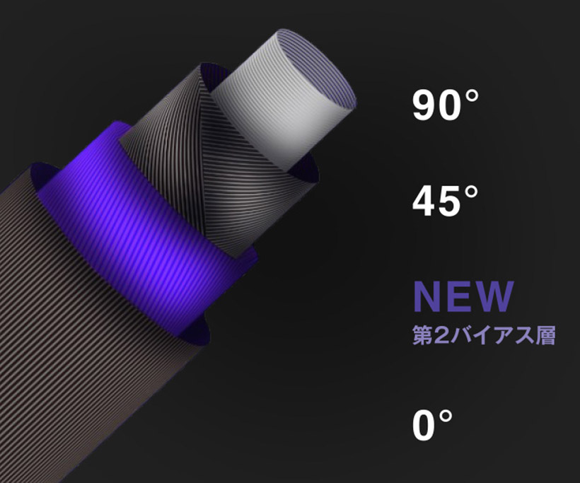 また、新テクノロジーの「DHX」を搭載。カーボンシャフトの特長である設計の自由度を活用し、45°層以外の第2のバイアス層を新たに積層したそうです(ちなみにこの第2のバイアス層の角度は秘密だそうです)。この第2バイアス層との組み合わせにより、ヘッドスピードの向上を実現しました。