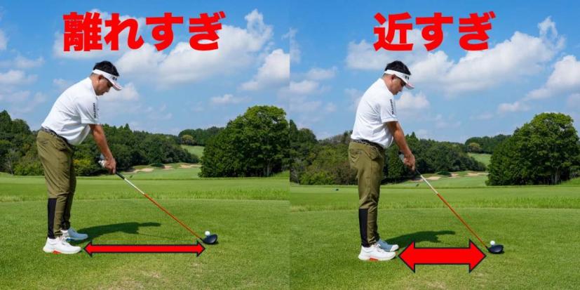 構えるたびにボールと体との間隔が変わってしまうと、当然のことながらスイングも毎回変わってしまいますよね。ちょうどいい間隔よりも近ければアップライトになってしまいますし、遠ければフラットになってしまいます。自分ではいつものように振っているつもりでも、きちんと構えた時のようには当てられなくなります。