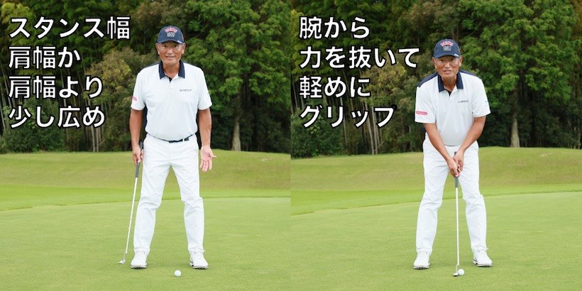 そこで私がおすすめしたいのは、下半身を使ってストロークする打ち方です。まず、いつもよりスタンス幅を広げて立ちます。いつも広めにアドレスしている人はそのままでもOKです。両腕からは力を抜き、軽めのプレッシャーでグリップしましょう。