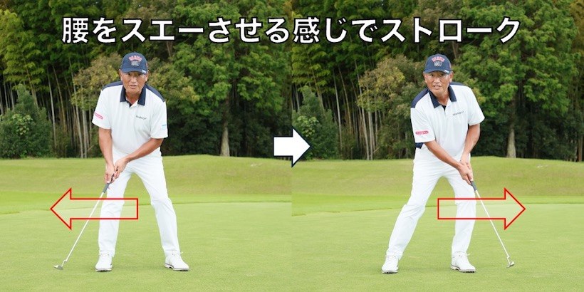 幅広スタンスで立ったら、テークバックパターでヘッドが動くのと同時に腰を右にスライドさせます。スイングで言うところのスエーの動作です。ダウンスイング~インパクト~フォローの過程では腰を左にスライド。左にスエーしながらボールをヒットします。