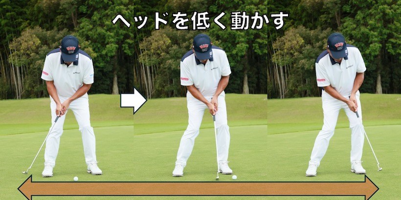 イメージ的には腰の水平移動メインでストロークする感じ。下半身を積極的に使うことでボールにエネルギーが乗って強い球が打てます。ポイントは腰の高さを変えないように動くこと。こうするとヘッドが低く動くのでしっかりインパクトできて方向性もよくなります。ヘッドを引く保つイメージをもてば腰の高さが変わりづらいので、そうしても構いません。