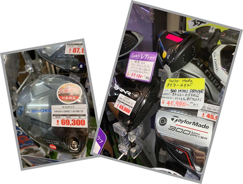 7月に発売されたキャロウェイとテーラーメイドのミニドライバーが予想以上に話題になっていますが、中古ショップでもミニドライバーの売買が盛んになりました。まだ最新モデルのミニドライバーはそれほど流通していませんが、テーラーメイドが昨年発売した『バーナーミニ』や3年前に発売した『300ミニ』が再びヒットしています。価格帯で言えば今年発売のミニドライバーは中古でも6万円以上しますが、3年前の『300ミニ』であれば3万円台後半から4万円台前半。3番ウッドに近い価格帯ということもあって、購入する人が多いです。