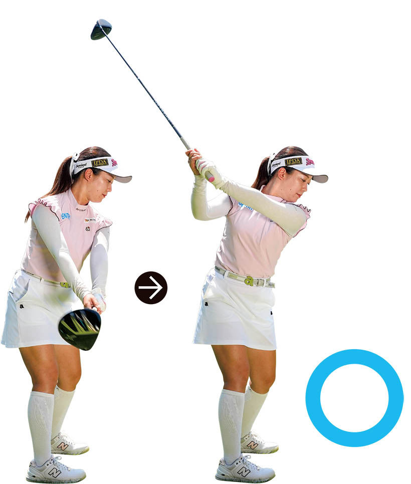 テークバックはモノを真後ろに 放り投げる感覚で振り子軌道に入る