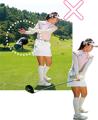 (写真左)テークバックで左ヒジを曲げたり、手首をヒネッてしまうタイプがヘッドカバーを投げると背中側に飛んでしまう。(写真右)前傾角度がキープできずに、両肩が同じ高さになっしまうとヘッドがインサイドに上がってしまう。
