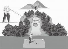 ホールの状況によって絶対に打ってはいけないエリアがありますから、まず危険な場所を避けてセーフティな場所にターゲットを設定しましょう。次にその場所から真上に垂直線をたどり、ティーイングエリアと同じ高さに目線を向けます。遠くの林や山、雲などを見る感じとなりますが、平坦なホールと同じ姿勢で構えることがナイスショットの第一条件なのです。