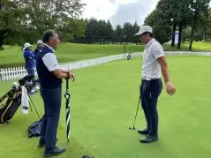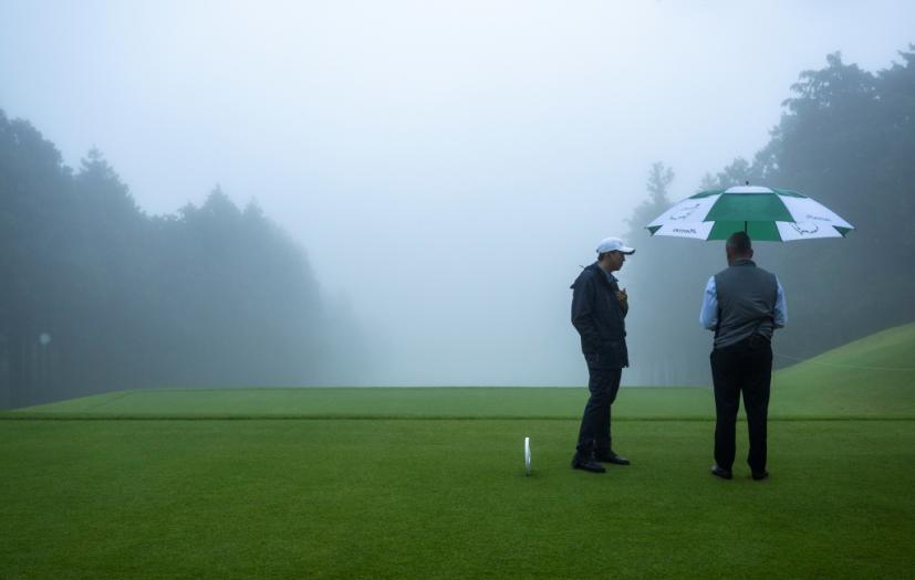 土日は都内でこの試合のテレビ解説をするため、実際のプレーを見ることができるのはこの日がラストチャンス。昼過ぎになってようやく6時間半遅れでスタートすることが決まると、霧と雨で足元が悪くなっていたのも気にせずにコースへと繰り出しました。
