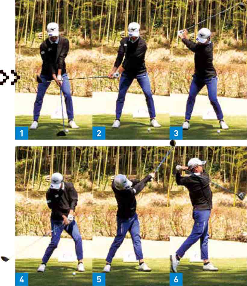 ベタ足で打つと体の開きも抑えられます。平田選手はハーフウェイダウンでも胸が右を向いたままクラブが下りてきて(写真04)、インパクトでも上半身が開いていません(写真05)。フォローでは体が開かないことでしっかりとフェースターンできます(写真06)。